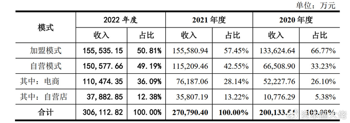 从周六福的业务模式来看,2019年至2022年报告期内,周六福主要以加盟模式为主,该模式下收入金额分别为179,032.92万元、133,624.64万元、155,580.94万元、155,535.15万元,收入占比为82.05%、66.77%、57.45%、50.81%。截至2022年末,周六福加盟店数量为3,974家。