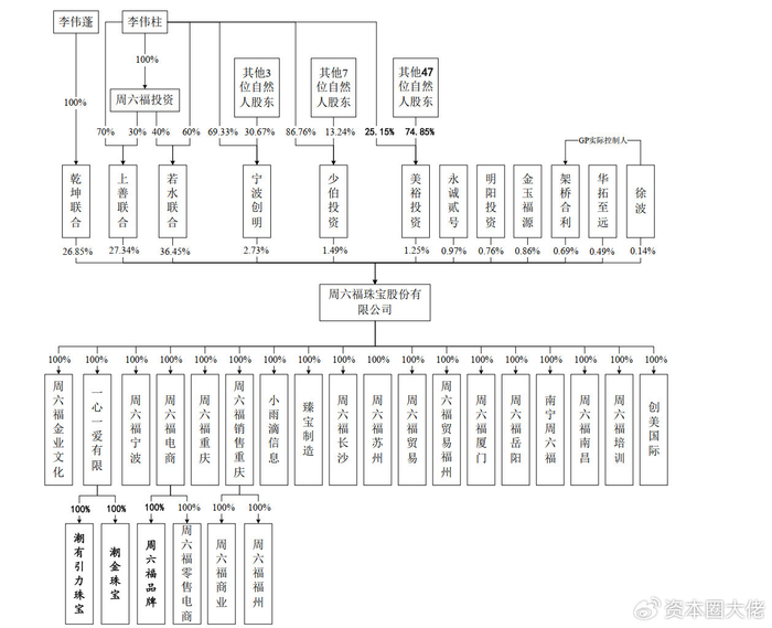 2005年4月至2015年12月前,周六福的股东一直是李伟柱和李伟蓬两兄弟。2015年12月,李伟蓬将其持有公司的30%股权转让给乾坤联合,将其持有公司20%的股权转让给上善联合;李伟柱将其持有公司10%的股权转让给上善联合,将其持有公司40%股权转让给若水联合。