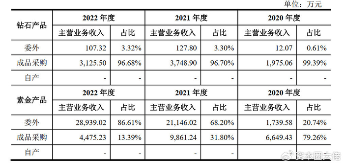 周六福自营店销售的素金产品2020年以成品采购为主,2021年起出于成本管控等因素逐步调整为以委外方式生产为主、辅以部分成品采购,2022年成品采购的收入占比保持持续降低趋势。从披露数据来看,仅钻石产品依旧保持成品采购,且钻石产品近年来收入稀少;素金产品在2022年度委外加工在主营业务收入中的占比高达86.61%。