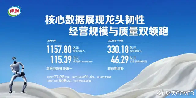 数据显示,2024年,伊利剔除商誉减值后的净利润为115.39亿元,同比增长12.2%;2025年第一季度,其扣非净利润为46.29亿元,同比增长24.19%。