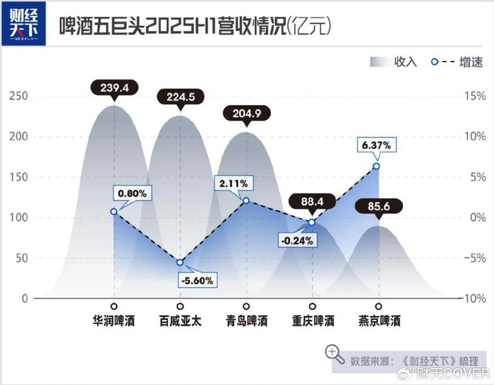 2025年上半年,五巨头中的两家外资控股的啤酒巨头——百威亚太和重庆啤酒,业绩都出现了下滑,销量增长情况也与国产三巨头有较大差距——百威亚太在中国市场的销量下滑了8.2%,重庆啤酒销量仅增长了0.95%,不及国产三巨头超过2%的增长。