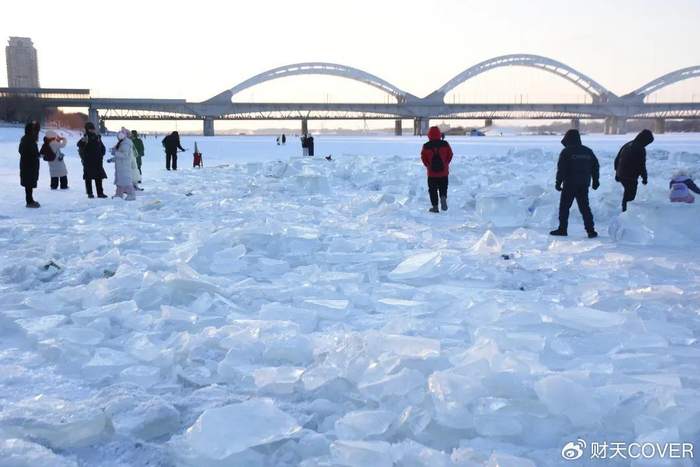 ▲哈尔滨道外区松花江畔,游客打卡“钻石海”