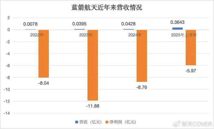2022年至2024年,蓝箭航天的营收分别为78.29万元、395.21 万元、427.83万元。报告期内,蓝箭航天的净亏损分别为8.04亿元、11.88亿元、8.76亿元。