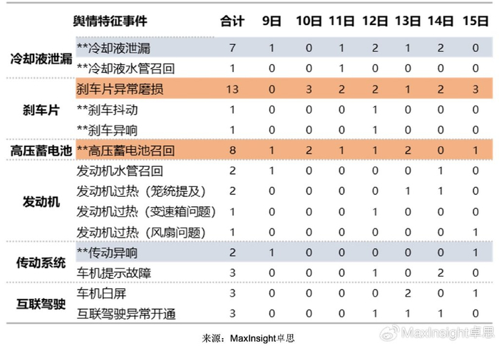通过持续的舆情特征监测,可以发现已追踪的热点事件,如冷却液泄露;也能看到潜在的风险事件,如刹车片异常磨损、高压蓄电池召回等,这为后续热点追踪提供了清晰方向。