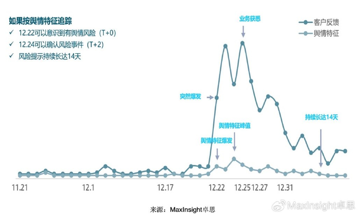 如果聚焦于舆情特征,在事件爆发当天就可以意识到风险,第二天可以确认风险,这大大早于业务部门实际的介入时间。