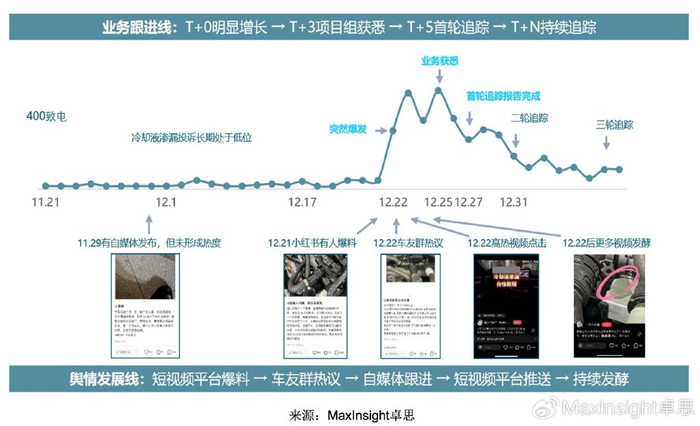 风险事件的爆发看似突然,实则有迹可循。以某汽车品牌冷却液渗漏事件为例进行分析,我们可以发现,风险事件的爆发与舆情高度相关。