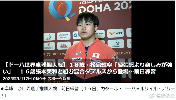 赛程显示,16岁的张本美和从17日的混合双打登场。松岛辉空和张本美和组成的这对新锐组合期待在混双赛场为本届世乒赛打响头炮。日本国内对两个年轻人的组合的期待也越来越高。更年轻的张本美和笑着说:“总是有点生气。今天控制住了(笑)在练习中想再表扬一下。”“一天比一天强,我的身体也很紧张。我想我取得了很好的交流”。日本媒体17日称,日本乒乓球队的混合双打由10多岁的年轻2人组开始打头阵,有望为队伍带来气势。