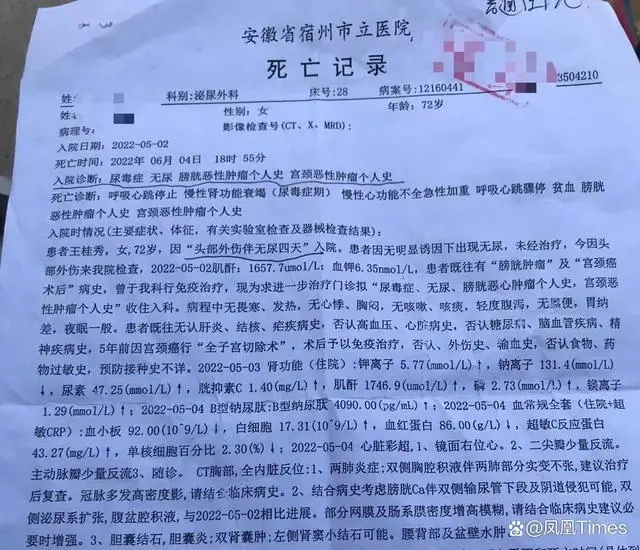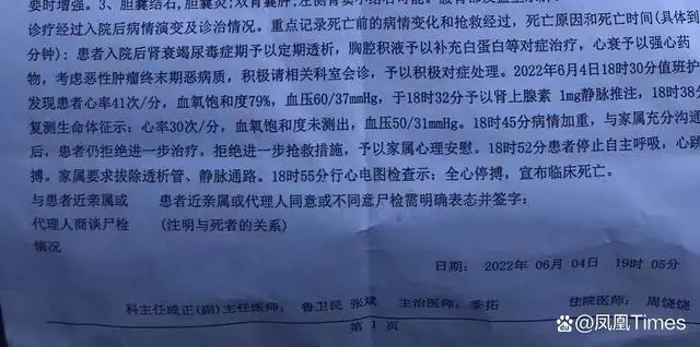 医院记录显示,徐丽萍母亲住院一个多月,6月4日因尿毒症等多病去世。