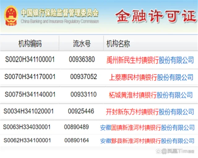 此次涉事的6家河南、安徽村镇银行金融许可证编号。来源:中国银保监会官网