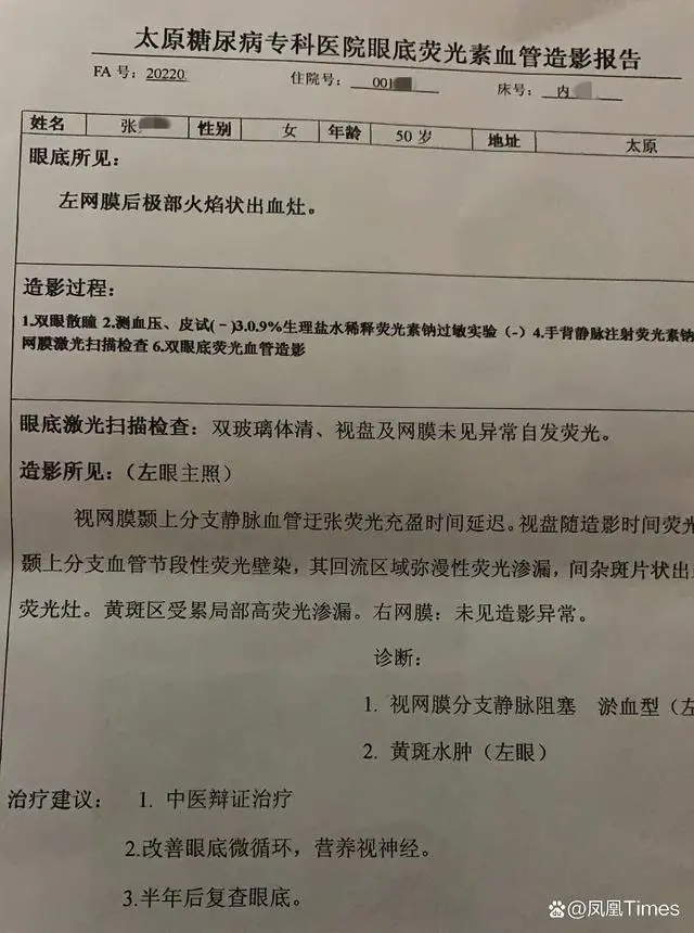 医生说,这是眼底静脉血栓出血造成的视网膜分支静脉阻塞,淤血形成了继发型的黄斑水肿。诱因是高血压,“医生说,急火攻心,就发生了小血管梗阻,相当于脑梗、心梗。”