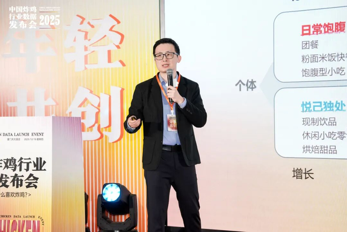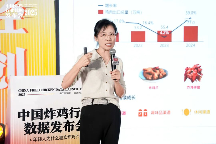 随后,红餐产业研究院执行院长唐欣首发《炸鸡品类发展报告 2025》,权威定调行业新风向 —— 炸鸡已从 “休闲小吃” 成功迈向 “高频刚需” 主流市场。报告数据显示,2025 年全国炸鸡品类市场规模较 2019 年实现大幅增长,下沉市场门店占比高达 54%,三线及以下城市成为增长核心引擎;消费端以 18-35 岁年轻群体为主力,周消费 1-3 次的用户占比超 60%,复购率显著高于其他休闲小吃品类。