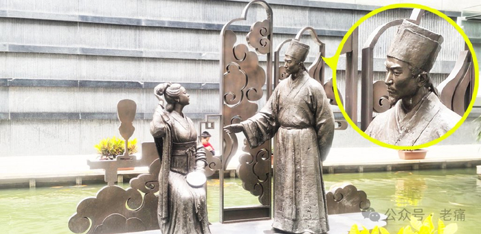 此处说点题外话,笔者近日在海南省博物馆中看到了苏轼与妻子王弗的塑像,乍一看感觉不错,再一看发现就发现怪怪的。首先是他俩好像吵架了,脸上表情非常严肃。其次是苏东坡雕像显得他眉骨很高、颧骨很高,这特征更像是海南人,不像四川人;并且他的鼻子过于笔挺,再配合上那一对剑眉,就显得过于硬朗,这也不符合人们对苏东坡的想象。(见下图)