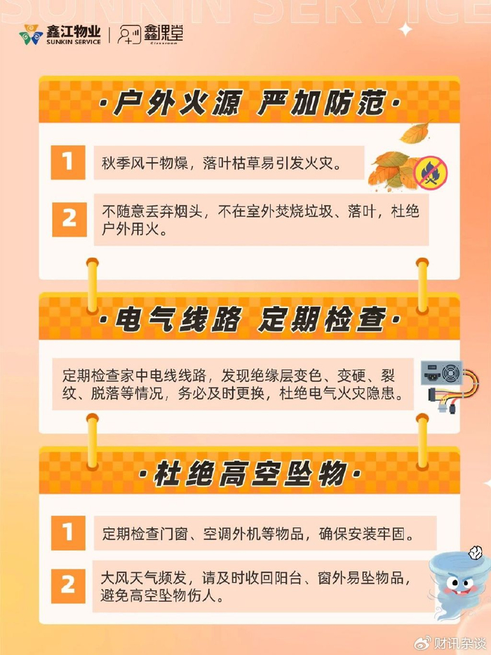 秋风送爽,带来了丰收的喜悦,也潜藏着安全的隐忧。在这个天干物燥的季节,鑫江物业始终警钟长鸣,心系每一位家人的平安。我们深知,安全是家的基石。【鑫江物业·鑫课堂】特别整理一份秋冬消防安全提示,从居家用电到楼道管理,从防火意识到应急准备,愿以精细化服务,守护您与家人的四季常安。防患于未“燃”,不仅是一句口号,更是我们共同的行动。让安全的种子在邻里间传递,让温暖的守护在家园生根。秋高气爽,安全先行。
