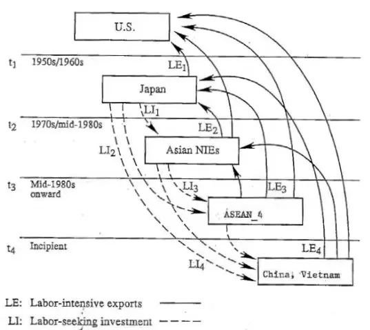 小泽辉智改造后的东亚经济体之间的动态雁型模式美国地位的一项体现是其强大的IT产业,正是由于信息技术的发展大大降低了沟通协调的成本,分工链条得以进一步细化和加强,亚洲的贸易模式开始发生革命性的变化,推动全新贸易样态的到来。最突出的表现是中间品贸易而非成品贸易成为主流,国家间海关流转的大量贸易都是零部件贸易。零部件贸易实际上更有利于中小国家参与产业链,因为在一个工业体系不完整的国家,很难在本国完成一个产品的所有生产环节。随着行业内贸易的发展,东南亚国家也开始大量进口原材料、出口制造业产品,机械、ICT和电气产品出口成为价值链贸易的核心产业部门。