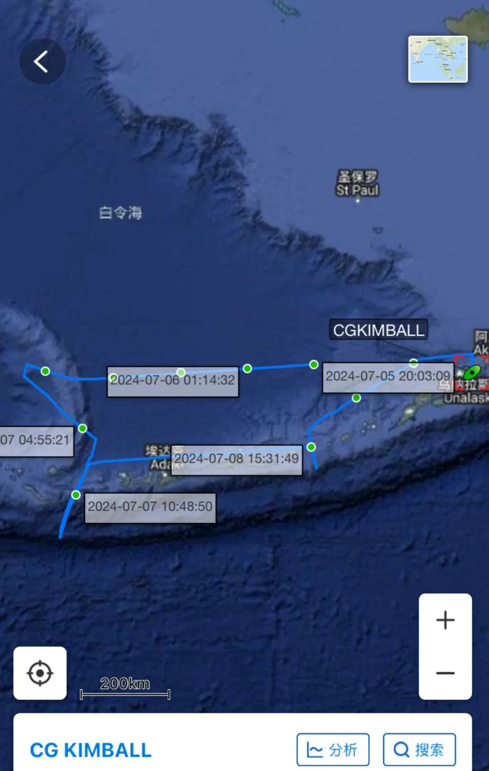 从航位上看,美国海岸警卫队所谓的“阿姆奇特卡海峡”,应当是阿留申群岛中部一个小岛阿姆奇特卡岛一侧的海峡,从这个海峡以北100海里已经深入白令海。