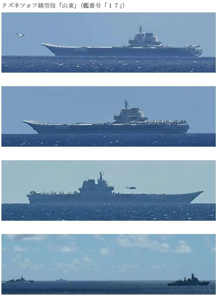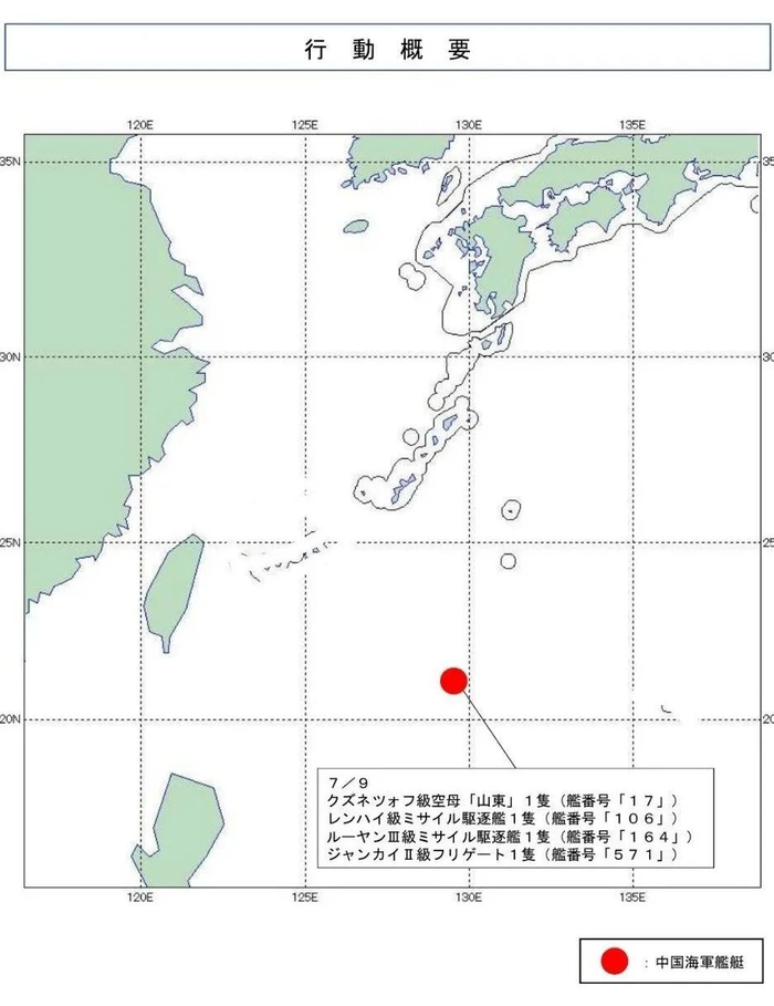 首先,是“山东”号航空母舰的行动。根据日本防卫省统合幕僚监部7月9日报告,当天晨7时许,日本自卫队驻佐世保第5护卫队“曙”号驱逐舰,在宫古岛东南方约520千米的海域,发现了正在向东航行的中国海军“山东”号战斗群。