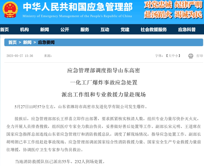 据应急管理部消息,5月27日11时57分左右,山东省潍坊市高密市友道化学有限公司发生爆炸。