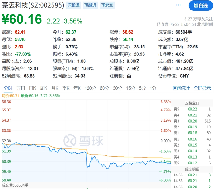或许是受到上述消息影响,A股收盘时豪迈科技报60.16元/股,下跌3.56%,总市值481.28亿元。