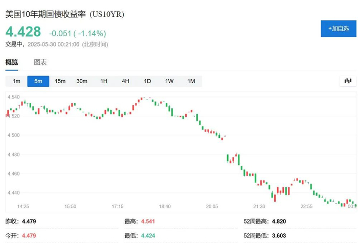美国10年期基准国债收益率加速下行,下破4.43%刷新日低。