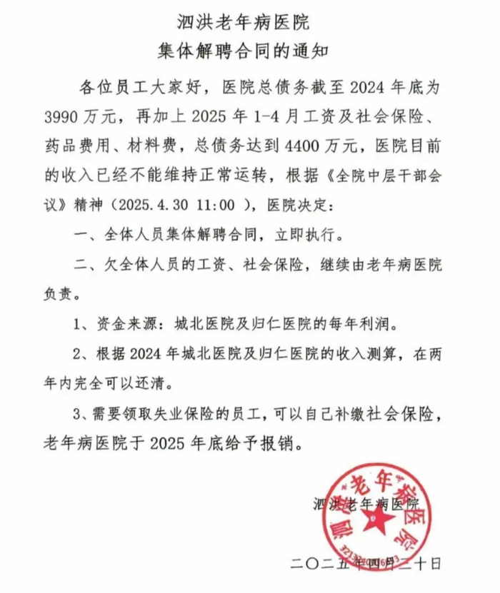 一则名为《泗洪老年病医院集体解聘合同的通知》写道,医院总债务截至2024年底为3990万元,再加上2025年1至4月工资及社会保险、药品费用、材料费,总债务达到4400万元,医院目前的收入已经不能维持正常运转。医院决定:全体人员集体解聘合同,立即执行,欠全体人员的工资、社会保险,继续由老年病医院负责。