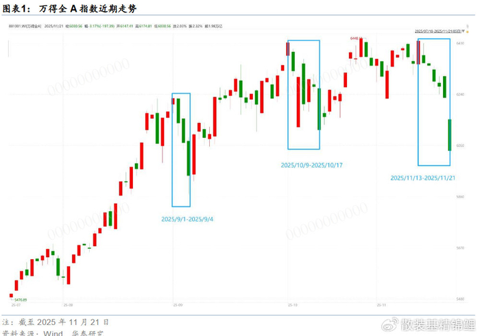 华泰证券复盘A股2025年7-11月走势后,发现统计区间内,A股整体出现三次较大回撤,分别是2025.9.1-2025.9.4、2025.10.9-2025.10.17、2025.11.13-2025.11.21。