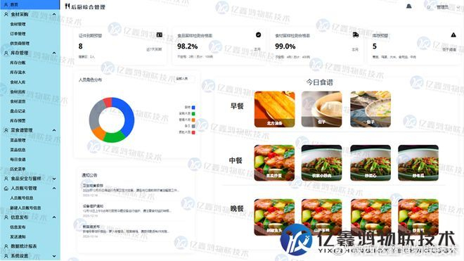 系统以“全流程管控、全数据贯通、全主体联动”为核心,构建14大功能模块,覆盖校园食堂经营管理全链条,实现从食材采购到膳食供应的闭环监管。