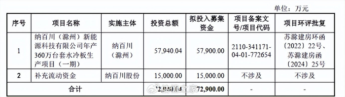 纳百川(滁州)新能源科技有限公司年产360万台套水冷板生产项目(一期)。本项目位于安徽省滁州市中新苏滁高新技术产业开发区,实施主体为公司的全资子公司纳百川(滁州),项目投资总额5.79亿元,建设期2年,产能达产期5年(含建设期)。当前本项目已形成约118万套/年的电池液冷板产能、4万套/年电池箱体产能,将续建30万套/年电池箱体产能。