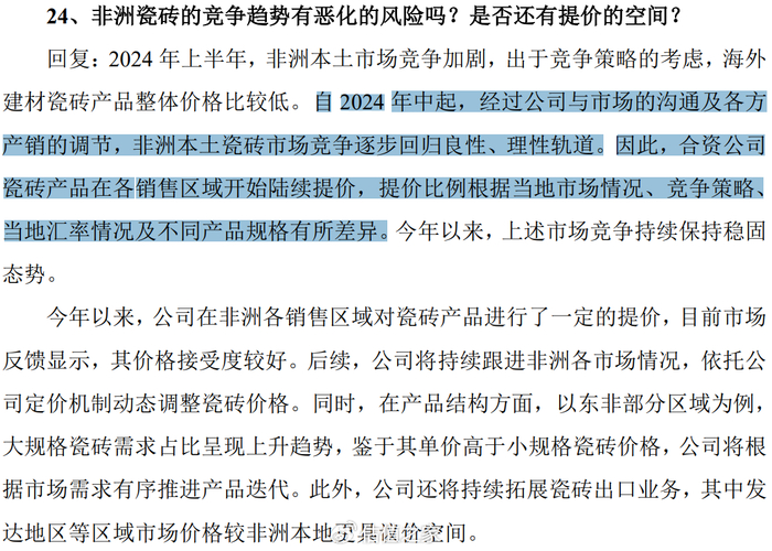 图片说明:非洲瓷砖市场于2024年中起开始好转,数据来源于《调研纪要》