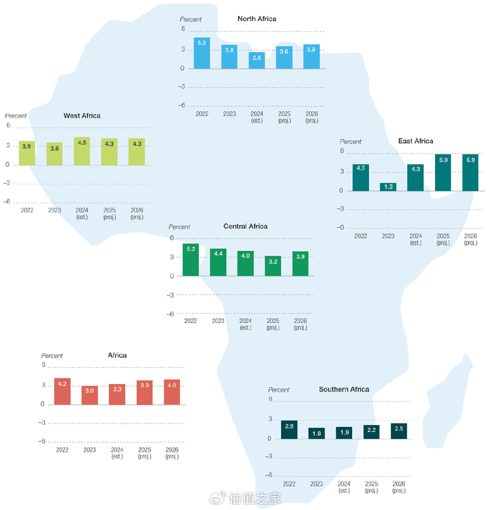 图片说明:非洲各地区增长表现及展望(百分比),数据来源于非洲开发银行集团