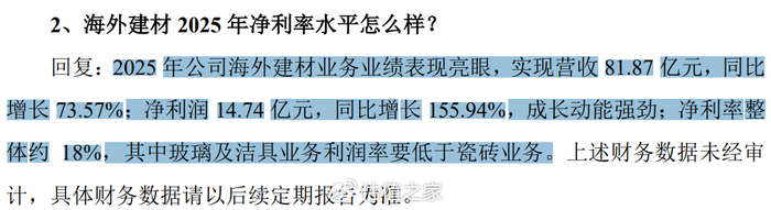 相比于重组方案,更靓眼的数据是非洲建材狂奔的业绩增速和利润率,2025年非洲建材业务实现营业收入81.87亿元,同比增长73.57%,实现净利润14.74亿元,同比增长155.94%,净利率约18%。
