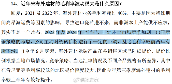 是因为非洲市场一片蓝海、缺乏充分竞争吗?熟悉科达制造的投资者或许比较了解,科达制造过去非洲建材业务的毛利率其实并不稳健,因为非洲瓷砖市场的竞争并非蓝海一片,尤其从2023年开始,竞争对手们向非洲瓷砖市场大量出口,价格战打的也非常惨烈,科达制造非洲建材业务毛利率从过去的40%+,在2023年和2024年分别下滑到35.70%和31.20%。