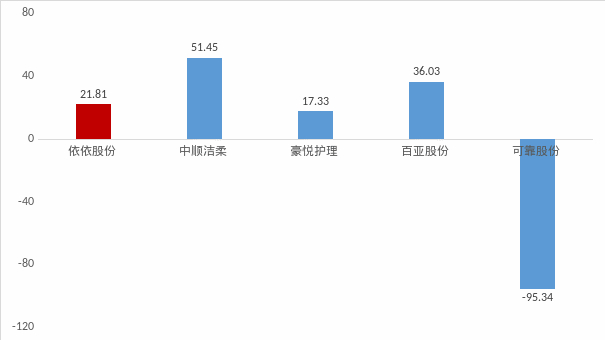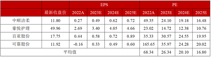 选取个护用品领域中顺洁柔、豪悦护理、百亚股份、可靠股份为可比公司,依依股份P/E(TTM)为21.81,从同期可比公司P/E(TTM)上看,公司目前估值处于较低水平(注:相关指标计算以2023年5月30日A股收盘价为基准)。