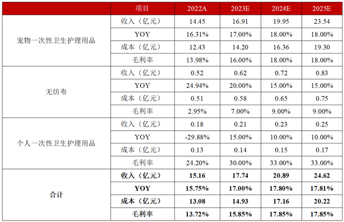 3.结合往年数据,将宠物一次性卫生护理用品、无纺布、个人一次性卫生护理用品的2023年收入增长预测设为17%、20%、15%;参考往年数据进行预测,将2024及2025年上述行业的收入增长设定为18%、15%、10%。