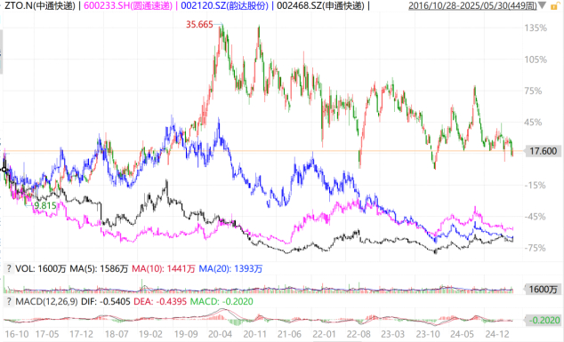 一方面,2016~2024年,“三通一达”的归母净利润由58.65亿上升到157.83亿,涨幅169.10%;另一方面,截止到2025年5月31日,除中通快递的股价17.60美元/股较发行价17.18美元/股(向前复权)略上涨2.44%外,其他三家的股价较2016年均大幅下跌,其中圆通速递较2016年下跌43.07%、韵达股份较2016年下跌61.38%、申通快递较2016年下跌60.52%。