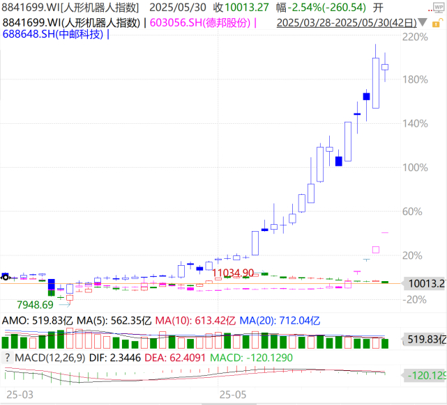 相比于主升浪过后阴跌不止的人形机器人,近期“四轮机器人”RoboVan的表现可谓风光无限。截止到5月30日,作为一季度市场主线的wind人形机器人指数(8841699.WI),已经跌破4月3日特朗普关税战前一个交易日的点位;而同一时期,RoboVan概念股中邮科技(688648.SH)上涨约184%,德邦股份(603056.SH)上涨约60%,且股价已经连续四个涨停板。