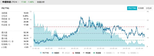 换句话说,尽管过去8年时间,快递行业(不含顺丰、极兔等)整体业绩增长了169.10%,但快递行业的整体市值却出现了大幅下跌,资本市场狠狠的给快递行业杀了一波估值。以中通快递为例,其PE(TTM)由IPO时期的50多倍,下杀到了现在的不到11倍,尽管过去8年归母净利润增长了约330%,但约80%的估值下杀幅度,基本完全抵消了EPS的正向贡献。