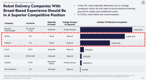 在硅谷著名投资人Cathie Wood(“木头姐”)发布的《ARK Invest Big Ideas 2025》报告中,“木头姐”提出了11个关键创新领域,它们将塑造2025年及未来的经济格局,其中自动化物流(Autonomous Logistics)便是其中之一。而新石器(Neolix)和美团等中国RoboVan公司因为在道路机器人配送方面表现突出,完成的配送数量远超美国的同类企业,竞争优势不仅体现在数据积累上,还体现在对复杂路况和多样化需求的适应能力上等原因,受到了“木头姐”的特别青睐。
