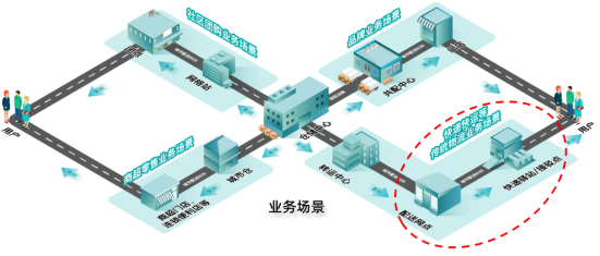 在快递行业,RoboVan目前主要应用在“配送网点”到“快递驿站”(下图中红色虚线圆圈标注的部分)这一段的运输,属于城市内的中短距离运输。