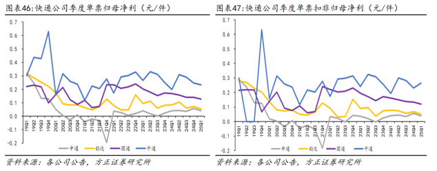 根据方正证券统计,2024年中通快递(02057.HK)、圆通速递(600233.SH)、韵达股份(002120.SZ)、申通快递(002468.SZ)的单票归母净利润分别为0.26元/票、0.15元/票、0.08元/票、0.05元/票,同比增速分别为-9.8%、-14.0%、-6.6%、+135%;