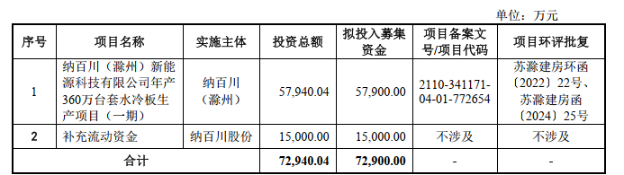 公司本次发行并上市的募集资金将投资于纳百川(滁州)新能源科技有限公司年产360万台套水冷板生产项目(一期)、补充流动资金项目。目前来看,公司拥有浙江温州、安徽马鞍山、安徽滁州三处生产基地,超20万平方米生产场地,作为本次募集资金投资项目的实施主体,安徽滁州生产基地仍在开展后续建设,实现对核心客户的全面配套供应能力。