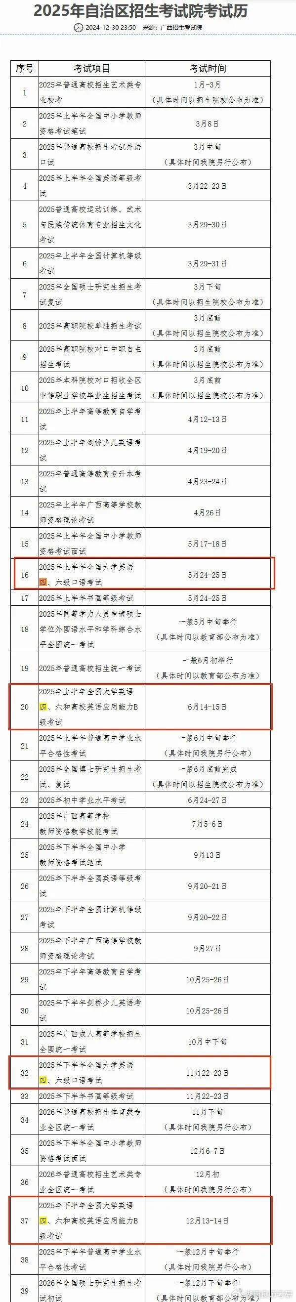根据广西招生考试院发布的《2025年自治区招生考试院考试历》可以看出2025年四六级考试时间为: