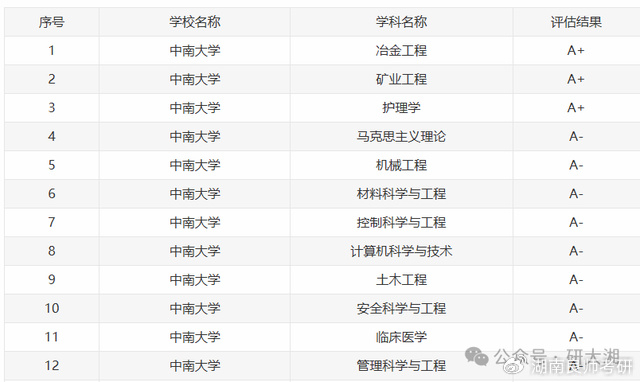在第四轮学科评估结果中,中南大学护理学和临床医学评为A+和A-。