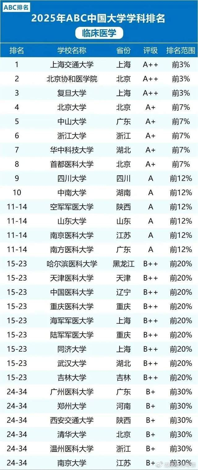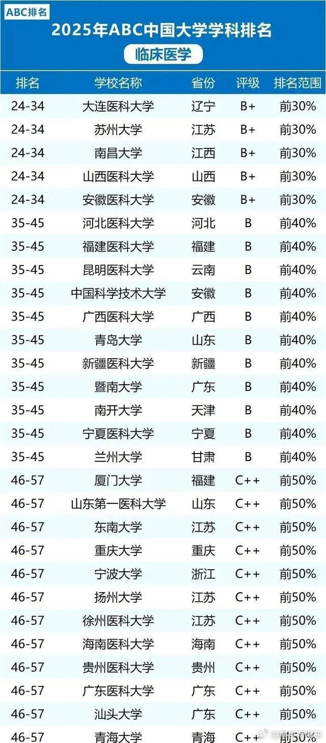 在这之前,中国大学排行榜(CNUR)网站正式发布了2025年ABC中国大学临床医学学科排名,共57所院校上榜。