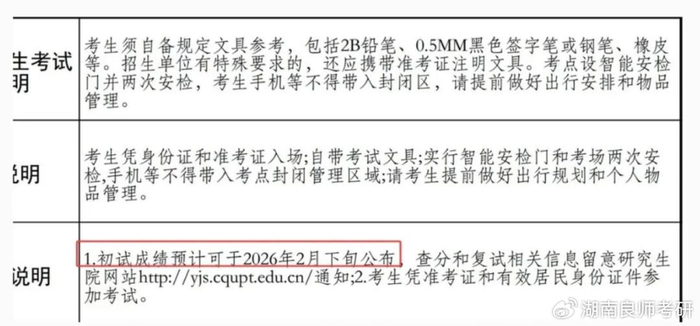 今年,重庆邮电大学在考研初试准考证中透露了2026考研初试成绩查询的时间!初试成绩预计可于2026年2月下旬公布。