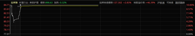 4月25日开盘,珀莱雅的股价高开高走,于9点31分触及涨停。截至午间发文,该公司股价为84.71元,总市值为335.7亿元。