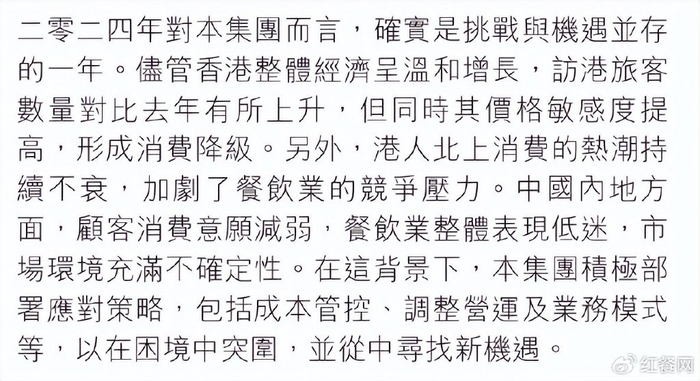 如太兴集团将业绩下滑归因于访港旅客的价格敏感度提高,消费降级成为趋势;以及港人北上消费的热潮持续不衰,加剧了餐饮业的竞争压力。