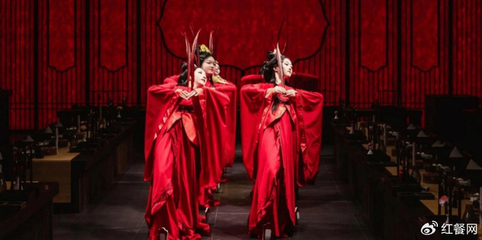 一进门,就有“侍卫”和“宫女”作揖行礼,入座后,又有专人奉茶、伺候沐手、焚香,还没等人回过神来,奏乐响起,台下宾客已经在一场接一场的舞剧中品尝佳肴。