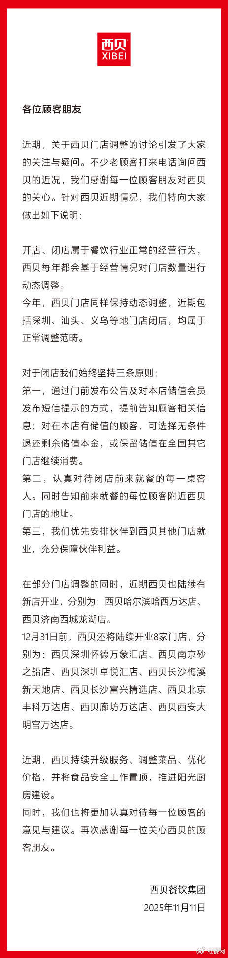 红餐网消息,11月11日,针对近期“西贝闭店潮”相关报道及不实传闻,西贝发布官方声明回应:西贝近期持续升级服务、调整菜品、优化价格,年内还将开店8家,部分门店闭店情况属于正常动态调整。