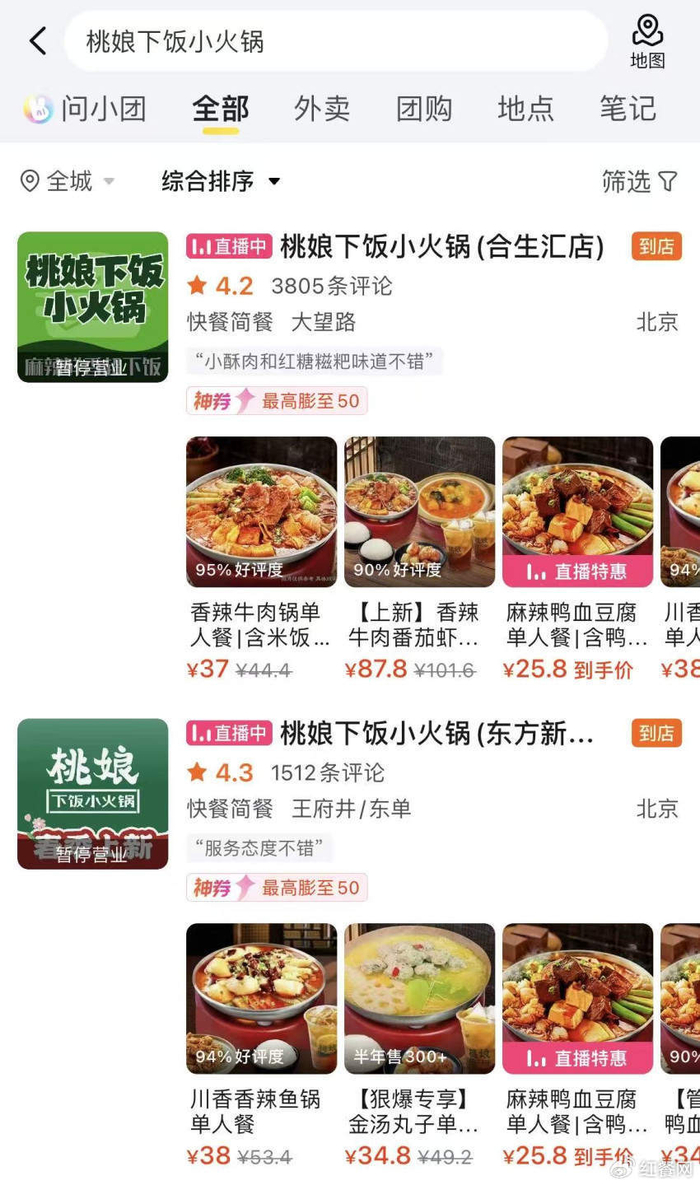 近日,桃娘下饭小火锅关闭北京全部门店的消息引发业内关注。11月11日,红餐网从美团平台查询确认,该品牌的北京合生汇店、东方新天地店、西铁营万达店和五棵松华熙店目前确实均显示“歇业关闭”或“暂停营业”状态。另据北京商报,目前其合生汇门店的铺面已被“博多天一天妇罗牛排饭”北京首店围挡替换。