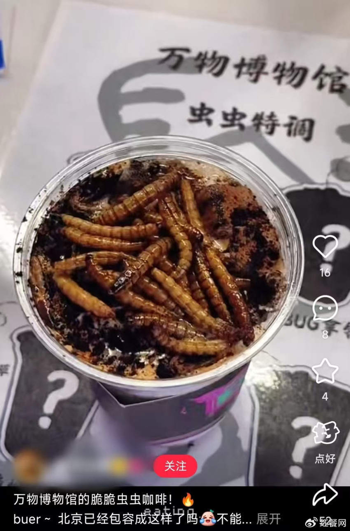最近,北京一家昆虫博物馆推出的“蟑螂咖啡”在社交媒体上引发热议。相关视频显示,这款咖啡上浸泡着大量焦黄的大麦虫,甚至能看到完整的深褐色蟑螂,奶泡上的褐色粉末更是现磨蟑螂粉,视觉冲击力十足,让网友直呼“炸裂”。